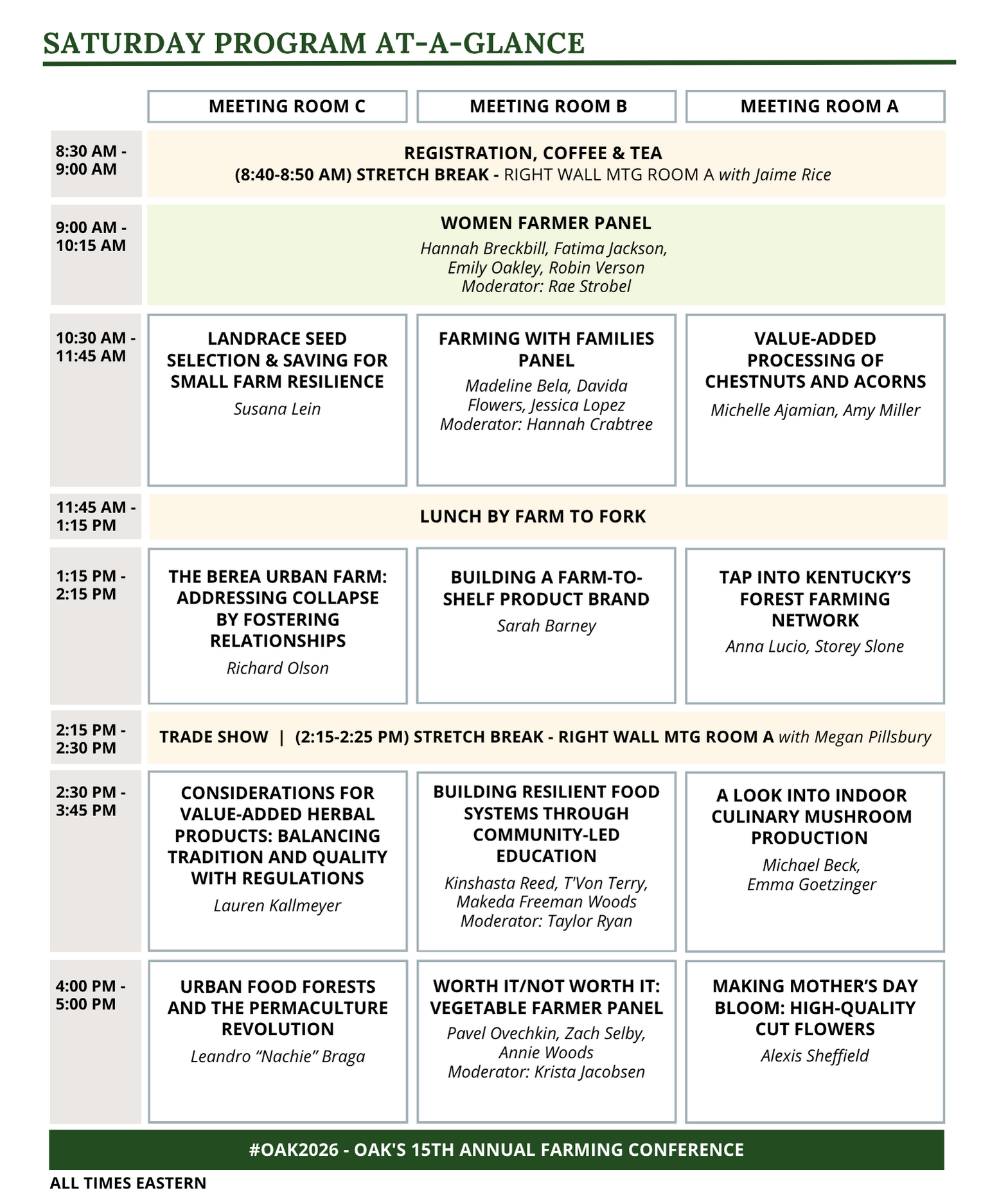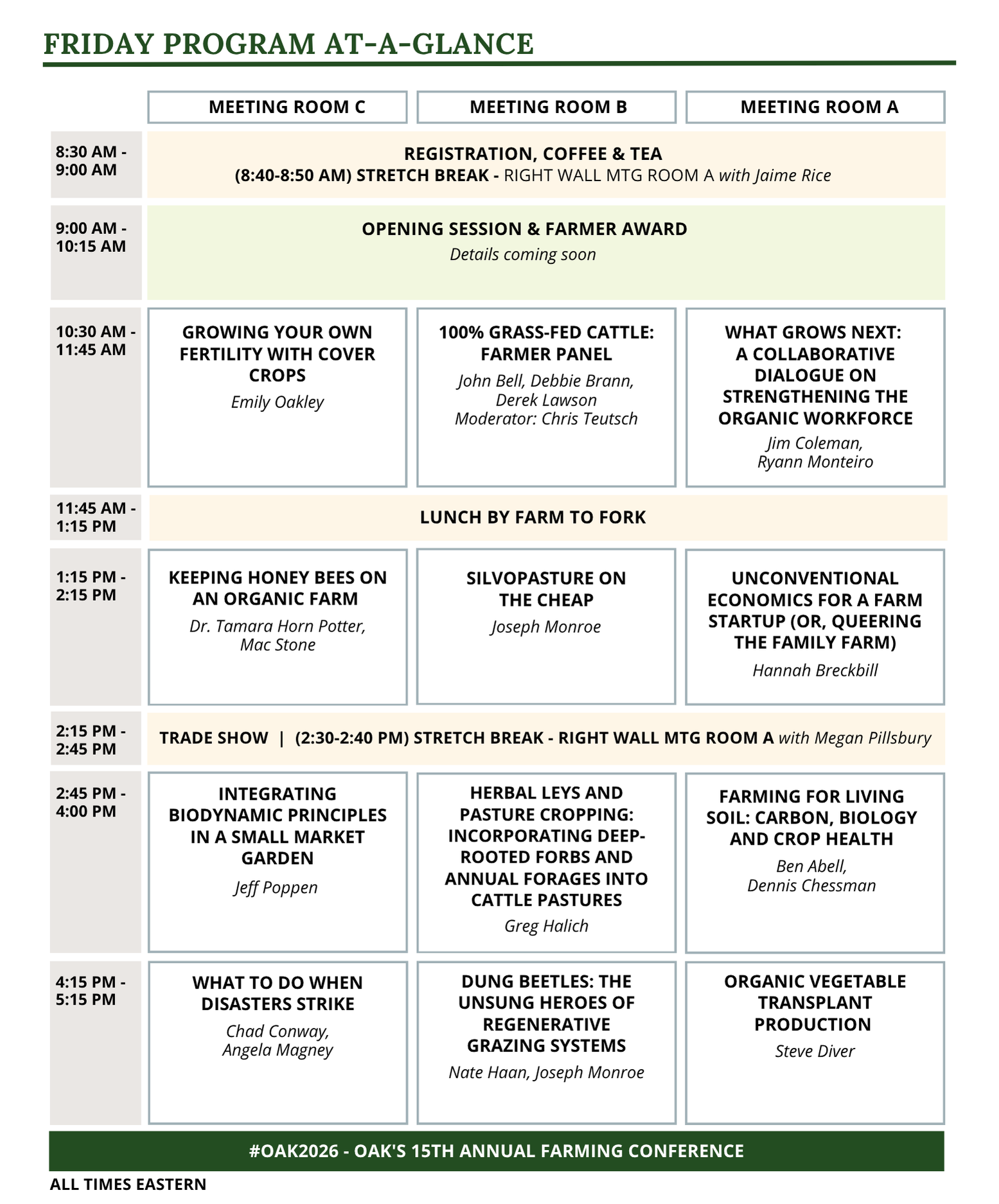 Welcome to the "Agenda At-A-Glance" for the 15th Annual OAK Conference, Cultivating Connections: Growing Organic Together for 15 Years. We look forward to seeing you at the conference!